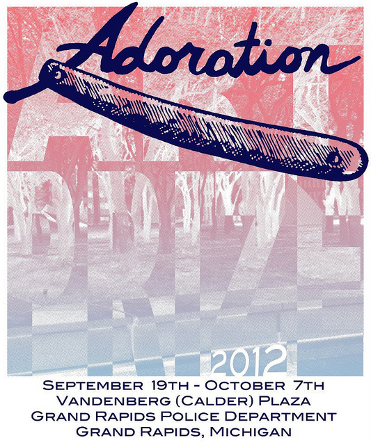 Inspired by the theatrics of ArtPrize, the Adoration curatorial team produced a site-specific exhibition, showcasing an array of multi-media artworks and performances. Using Calder Plaza and the Grand Rapids Police Department as a backdrop, an international ensemble of thirty artists has been brought together to stage the public exhibition Actions : Mutations : Revisions : Formations. For more details see the exhibition guide book (available in printed format during ArtPrize). Or visit www.adorationdetroit.com